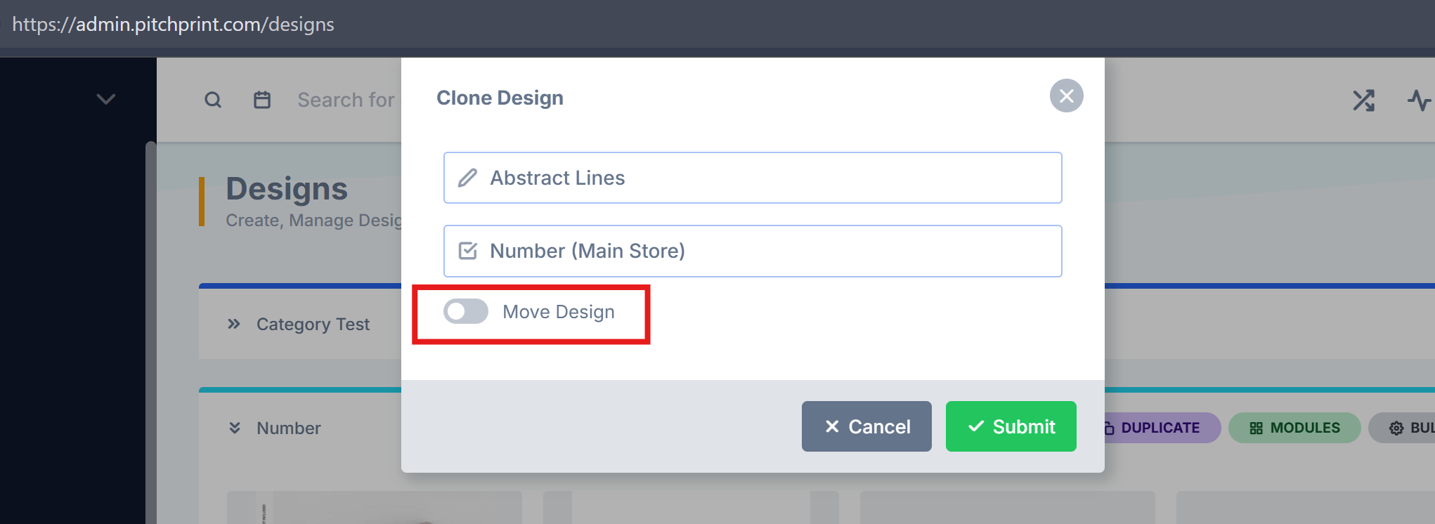 Move Designs Across Categories - The move functionality has been reintroduced in the PitchPrint admin. This feature was previously removed while we refined its behavior, and it has now been fully rebuilt for improved reliability. You can now easily move designs between categories.
