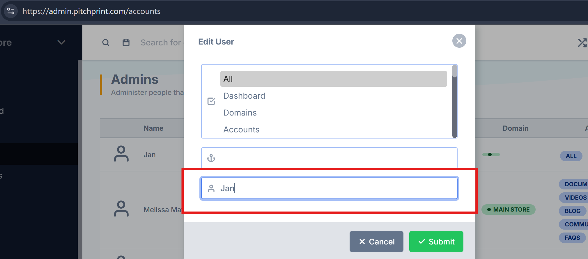 Edit User Name in PitchPrint Admin - Previously, administrators could only modify the store association and access permissions for an admin user. This update introduces the ability to edit user and admin names directly within the PitchPrint admin panel.